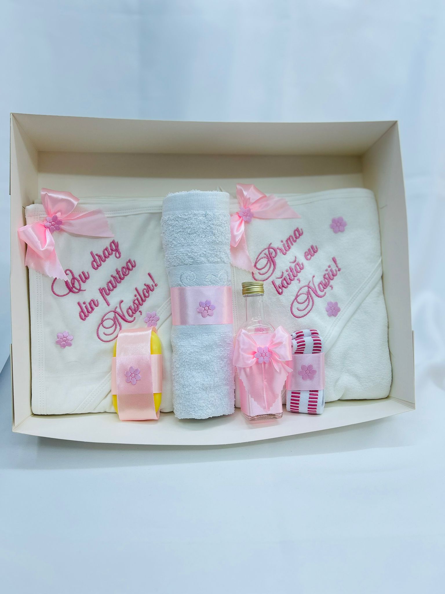 Prosop moale cu glugă brodată, decorată cu accente roz;