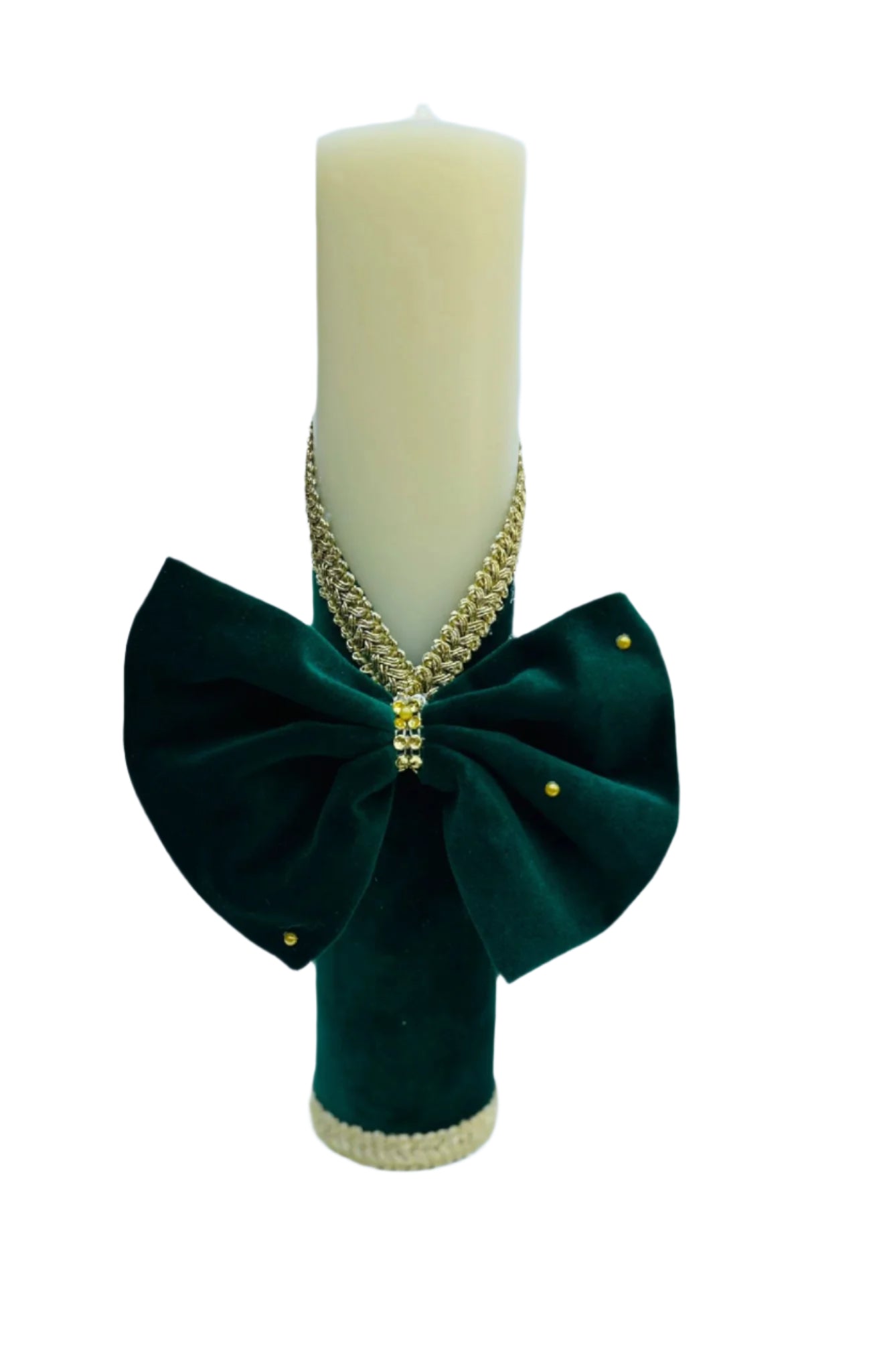 Această lumânare de botez este realizată manual cu atenție la fiecare detaliu, reprezentând atât frumusețea momentului, cât și semnificația sa spirituală. Decorată cu material textil, panglică din catifea și elemente personalizate (nume, dată, mesaj), lumânarea adaugă un plus de rafinament ceremoniei.